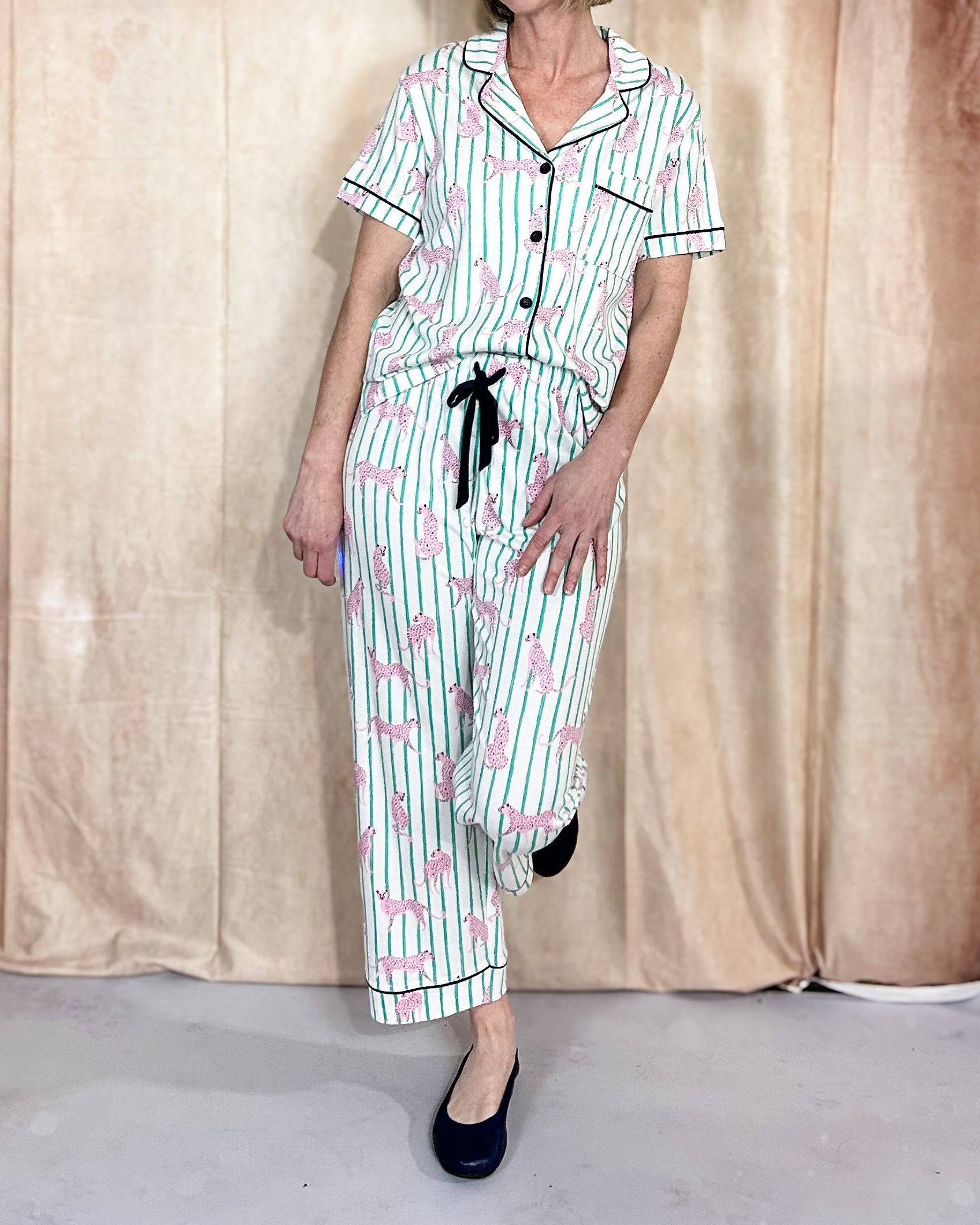 Wake up in style with our Jaguar PJ Set, where bold stripes and playful jaguar prints create the perfect blend of fun and comfort. The short-sleeve button-down top features contrast piping and a practical chest pocket, while the matching pants offer an elastic waistband and adjustable drawstring for a customized fit. Designed for lazy mornings and restful nights, this set keeps you cozy without compromising on personality.