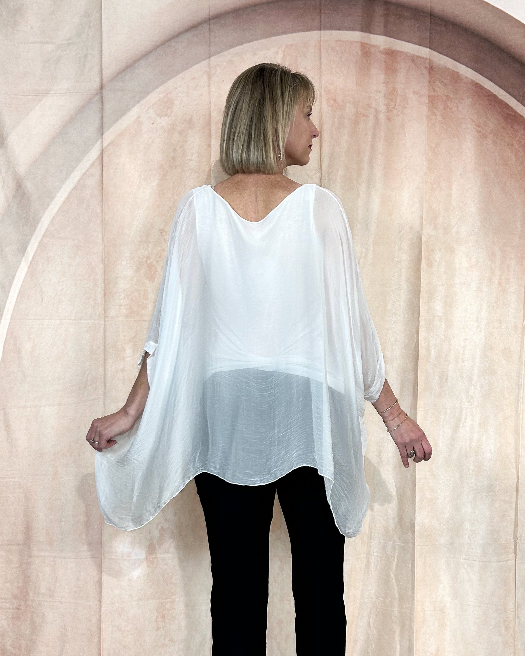 Introducing the White Flow Top, where effortless elegance meets everyday versatility. Crafted from luxurious 100% Italian silk, this piece features a gracefully flowing silhouette that transitions seamlessly from casual to refined. Whether you're dressing it down with denim or elevating it for an evening out, this timeless top becomes an instant wardrobe essential. The fluid drape and premium fabric create a flattering, comfortable fit that works beautifully across any occasion—a true repeat-wear favorite.