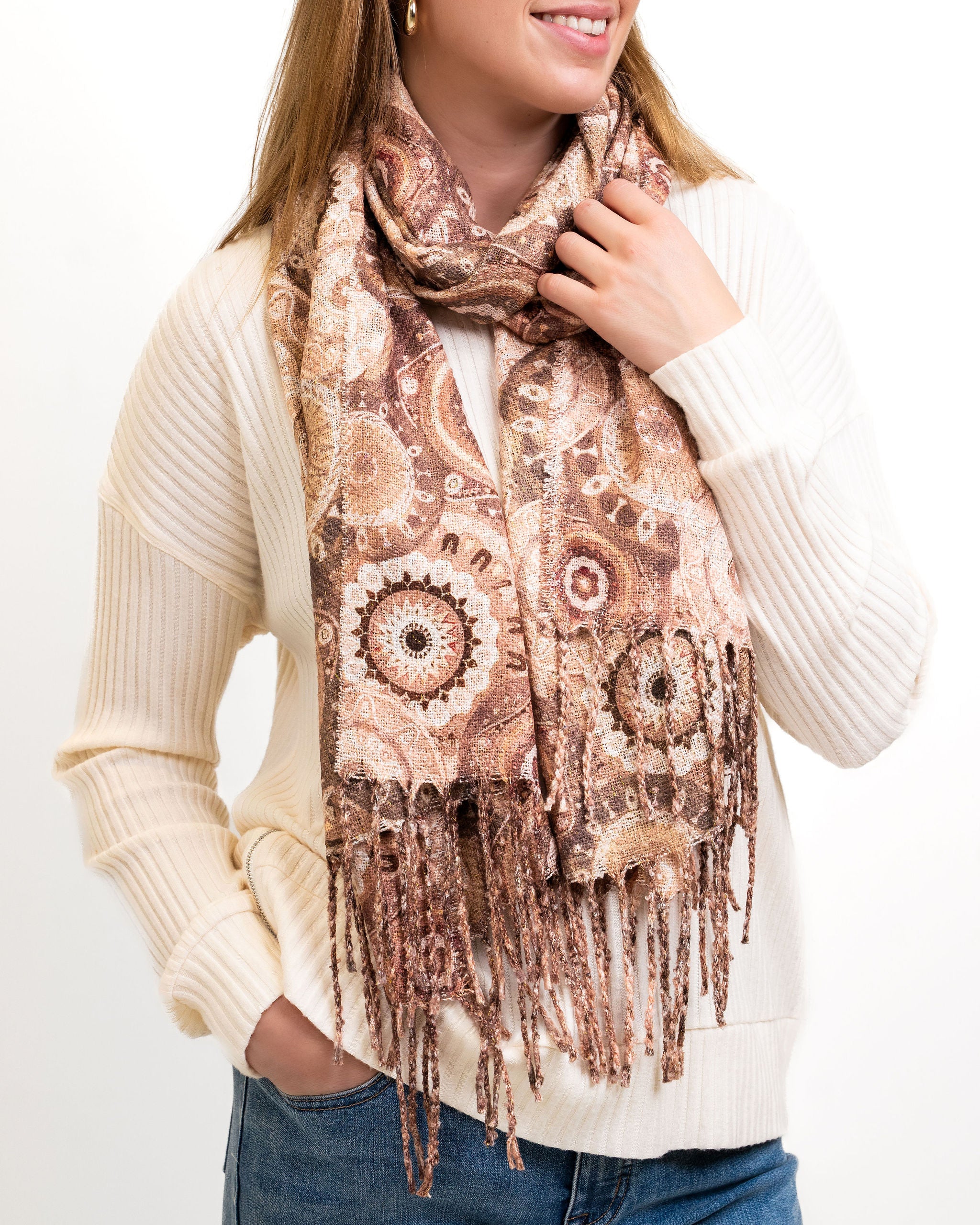 This ornate scarf features a delicate medallion print subtly enhanced with a touch of gold, adding elegance to any outfit. Its soft fabric ensures comfort while making a beautiful statement, perfect for elevating your everyday look with a graceful and refined touch.