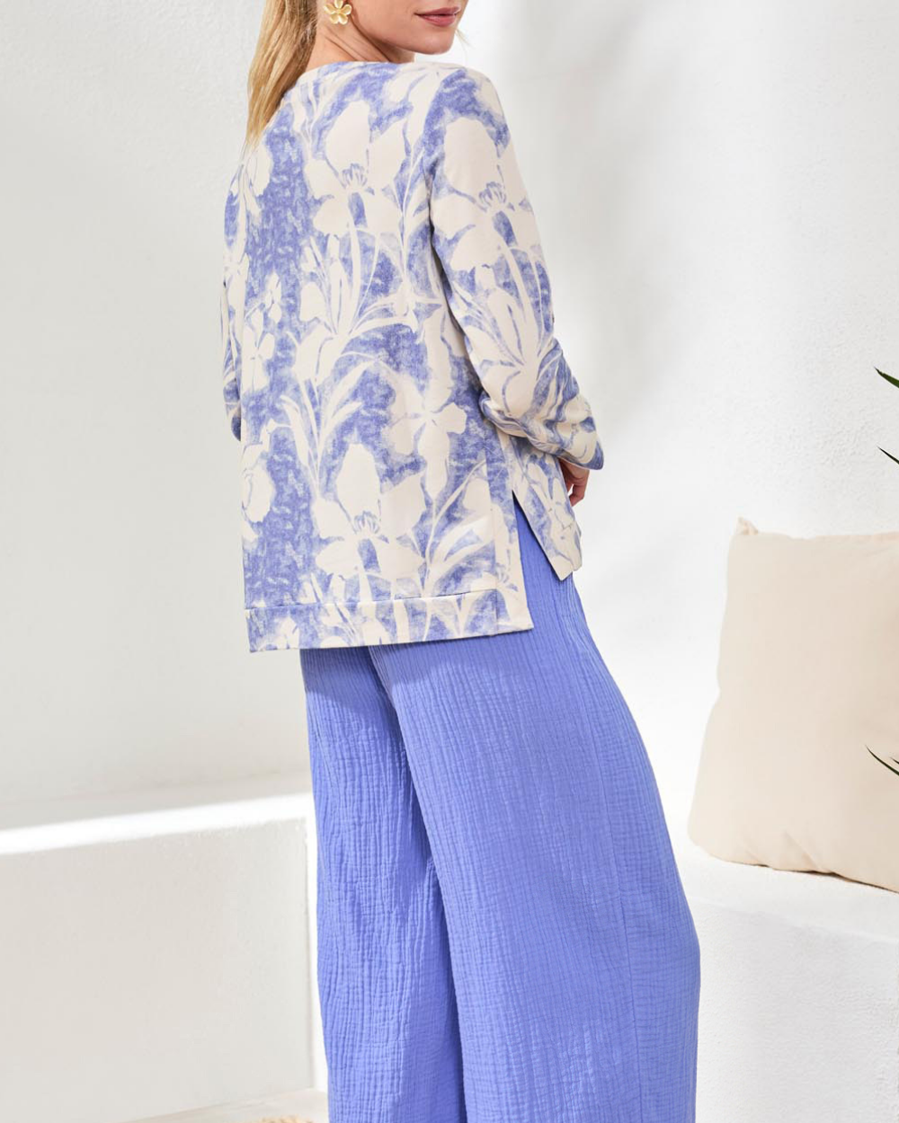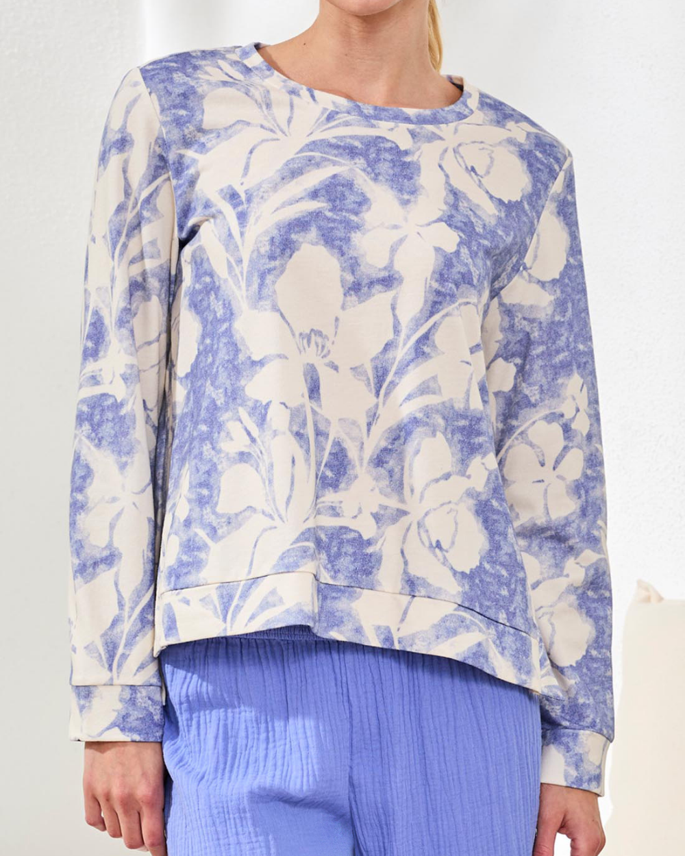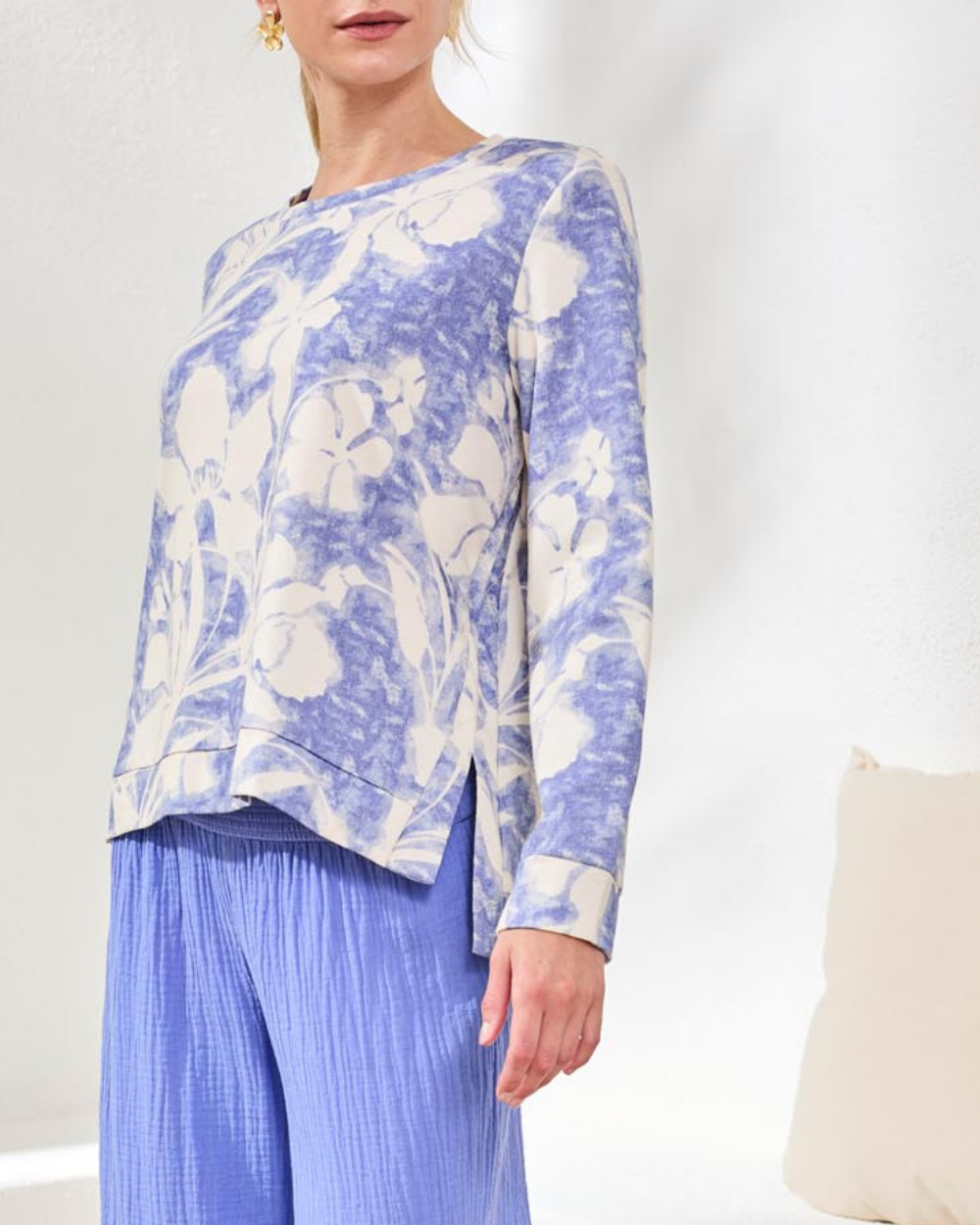 Effortless style meets comfort in this crew neck top, crafted from lightweight printed French terry with a relaxed fit. Side slits provide movement and layering flexibility, while the baja blue tropical flower print adds instant visual interest. Ultra-soft and versatile, it's perfect worn solo or layered under your favorite jacket for polished spring looks.
