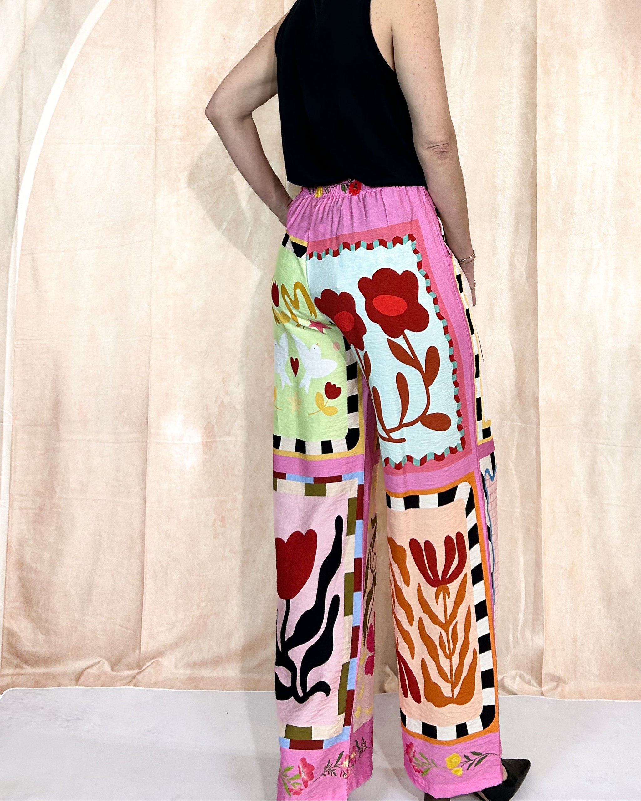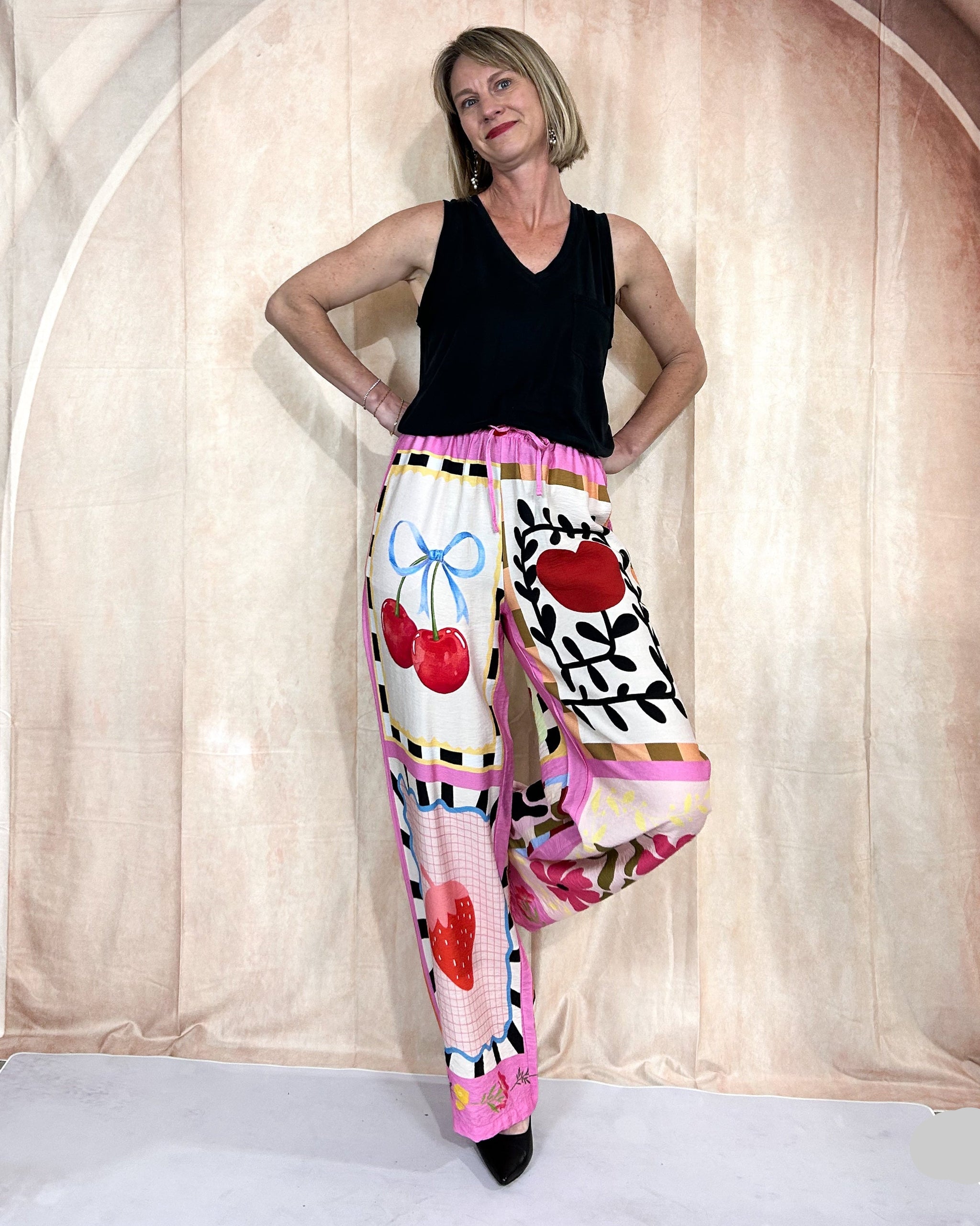 Step into style with these vibrant Cherry Pants, featuring playful graphics of cherries, strawberries, and doves across the fabric. The high-rise, straight-leg silhouette pairs with an elastic waistband and adjustable tie for comfortable all-day wear. Perfect for making a statement—style with a black top and bold jewelry to let the colorful design shine.