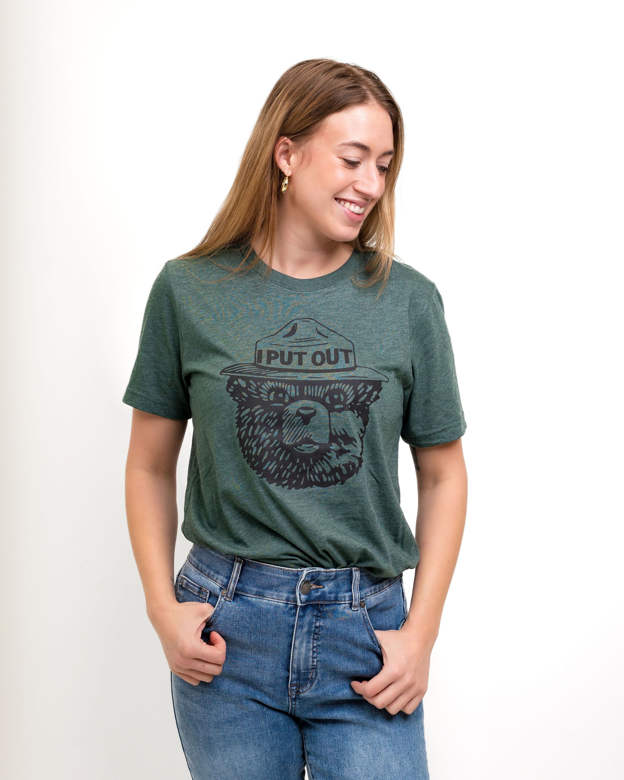 This Smokey Bear Tee features a bold "I Put Out" graphic in black on a comfortable green fabric. Designed with a classic crew neck and a unisex fit, it offers both style and ease for everyone. Show your support for wildfire prevention with this cheeky, casual tee that combines a funny message with everyday wearability.