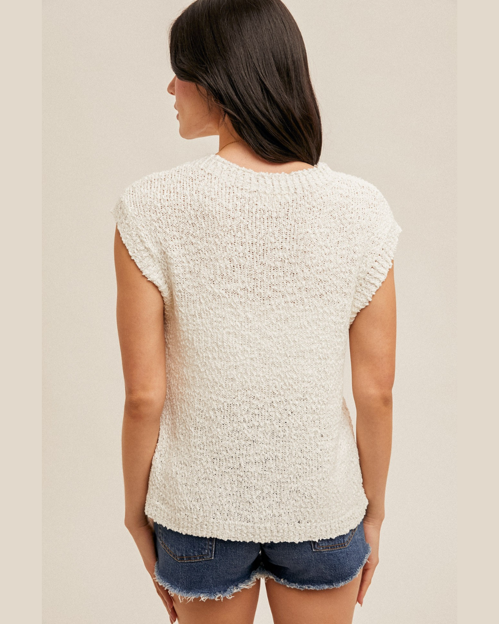 Effortless layering meets relaxed comfort in this white knit sweater tee. Crafted from a loose, knit fabric, it drapes beautifully for an understated silhouette. Delicate cap sleeves add a touch of feminine detail without bulk. Perfect for pairing over basics or wearing solo, this versatile piece transitions seamlessly from casual weekends to laid-back office days. A wardrobe essential that feels as good as it looks.